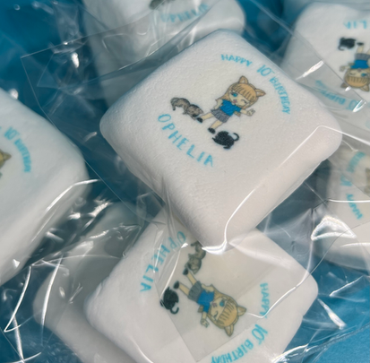 Marshmallow squares sold by the dozen. and packed individually. We can print characters, personalized messages, photos, and any theme of your choosing. Simply upload the photo you'd like printed.